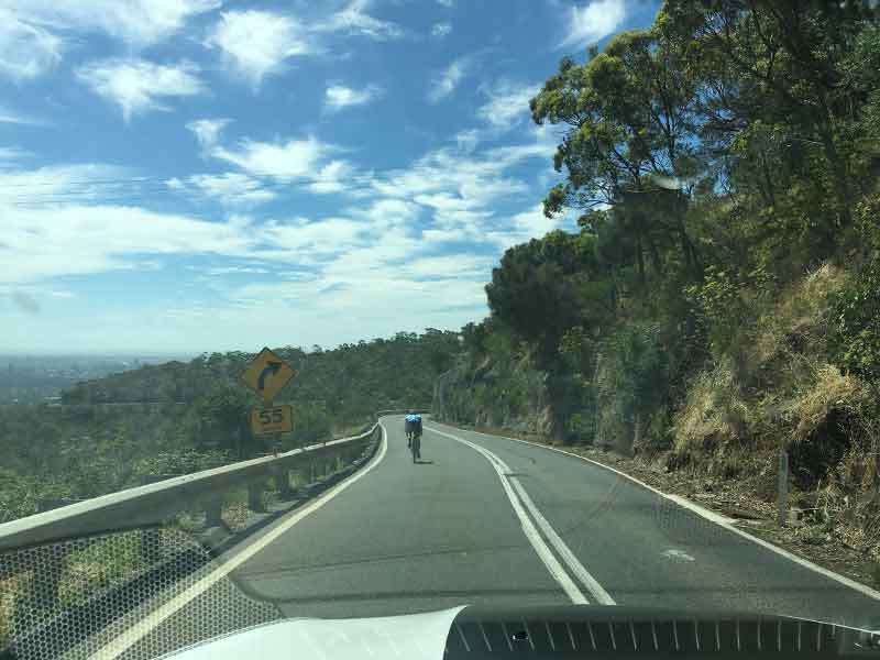 The roads from Mount Lofty Summit to Waterfall Gully Road were really narrow, windy and with double lines so there is no chance of overtaking. While the (crazy) bike rider was going fast, a car could go faster.